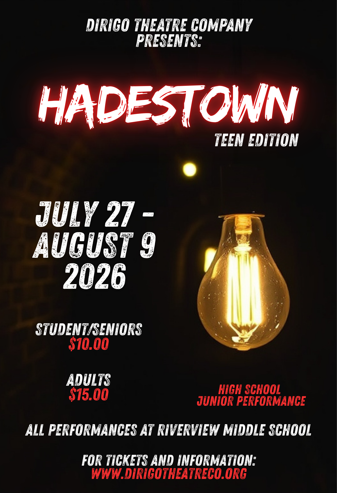 Here at DTC, we also believe that finances should not be an obstacle for exposure to the arts, particularly when it comes to education. That is why for each of our Workshops and Classes we offer a Reduced Tuition Program and Payment Plan Options for those families who may not be able to budget for this additional expense. For more detailed information on applying for either of these financial assistance options, please email us dirigotheatreco@gmail.com. Also know that any discussions surrounding finances and tuition assistance are completely confidential.